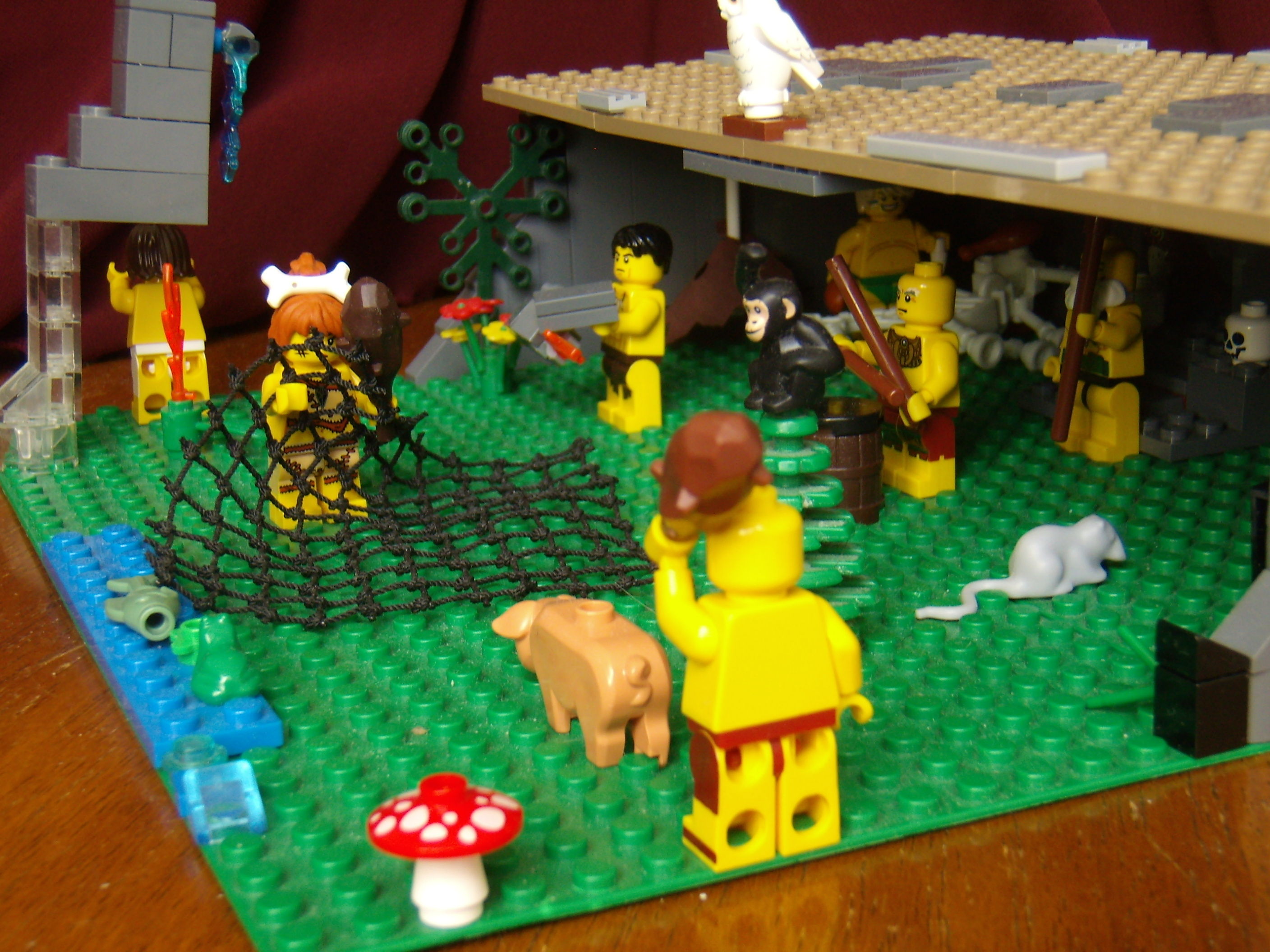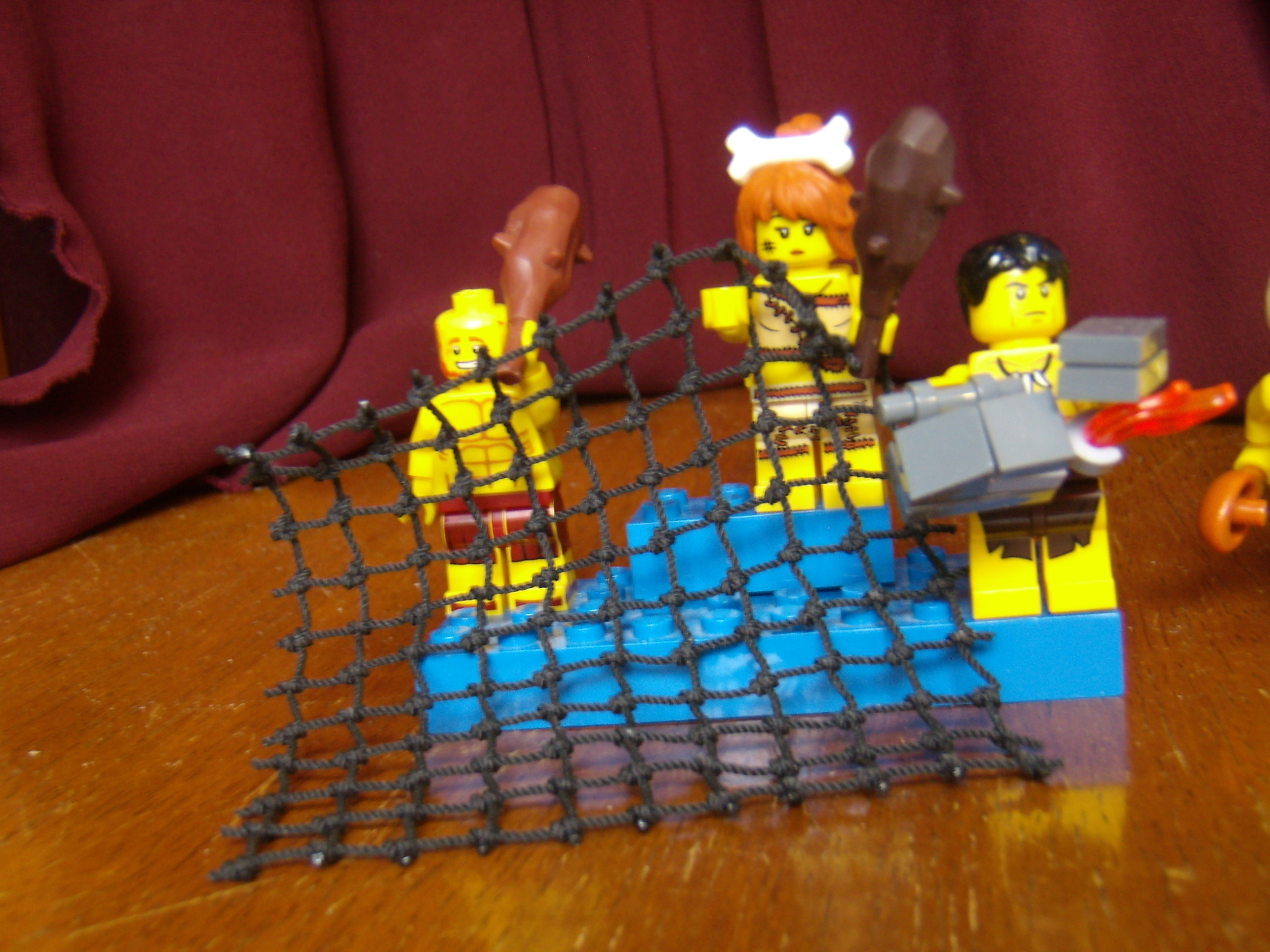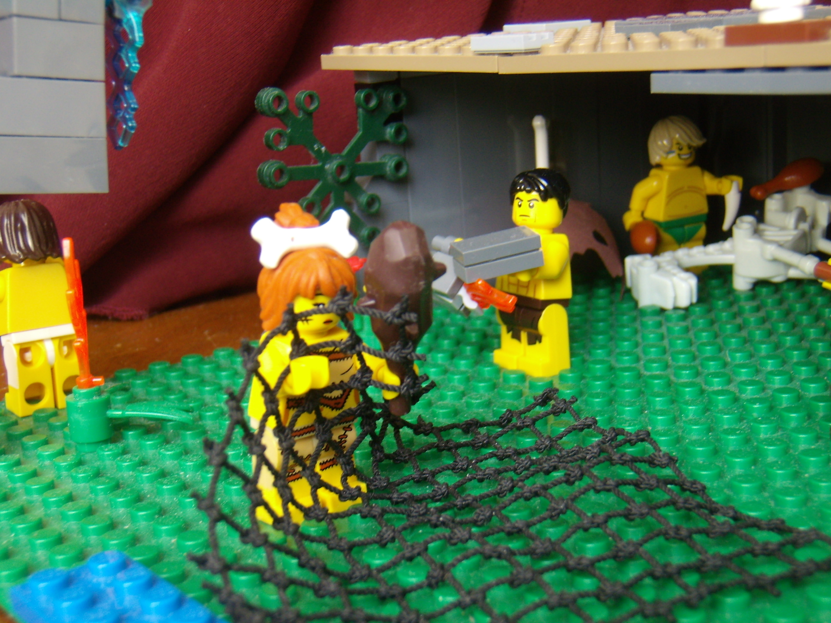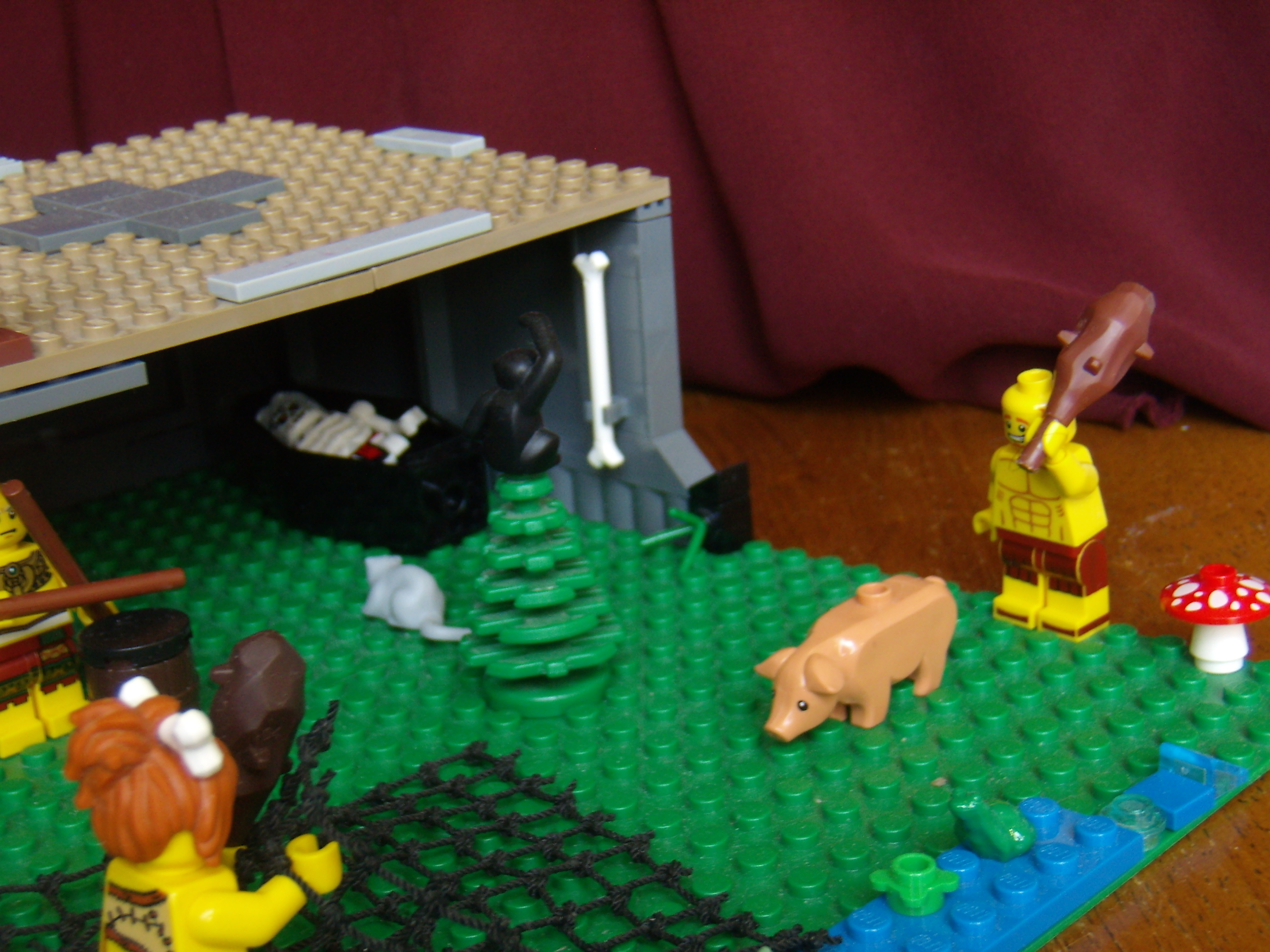 LEGO MOC - Because we can! - Caveman fire discovery: Река и улов на берегу. Пещерная женщина постаралась и поймала сетью к обеду рыбу, лягушку и водоросли, а теперь вот-вот поймает свинью.