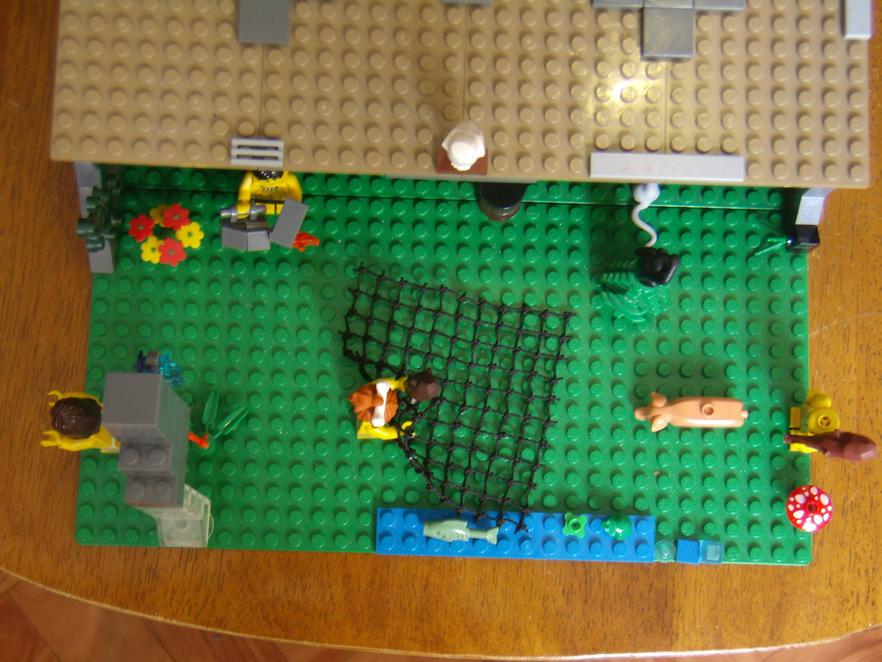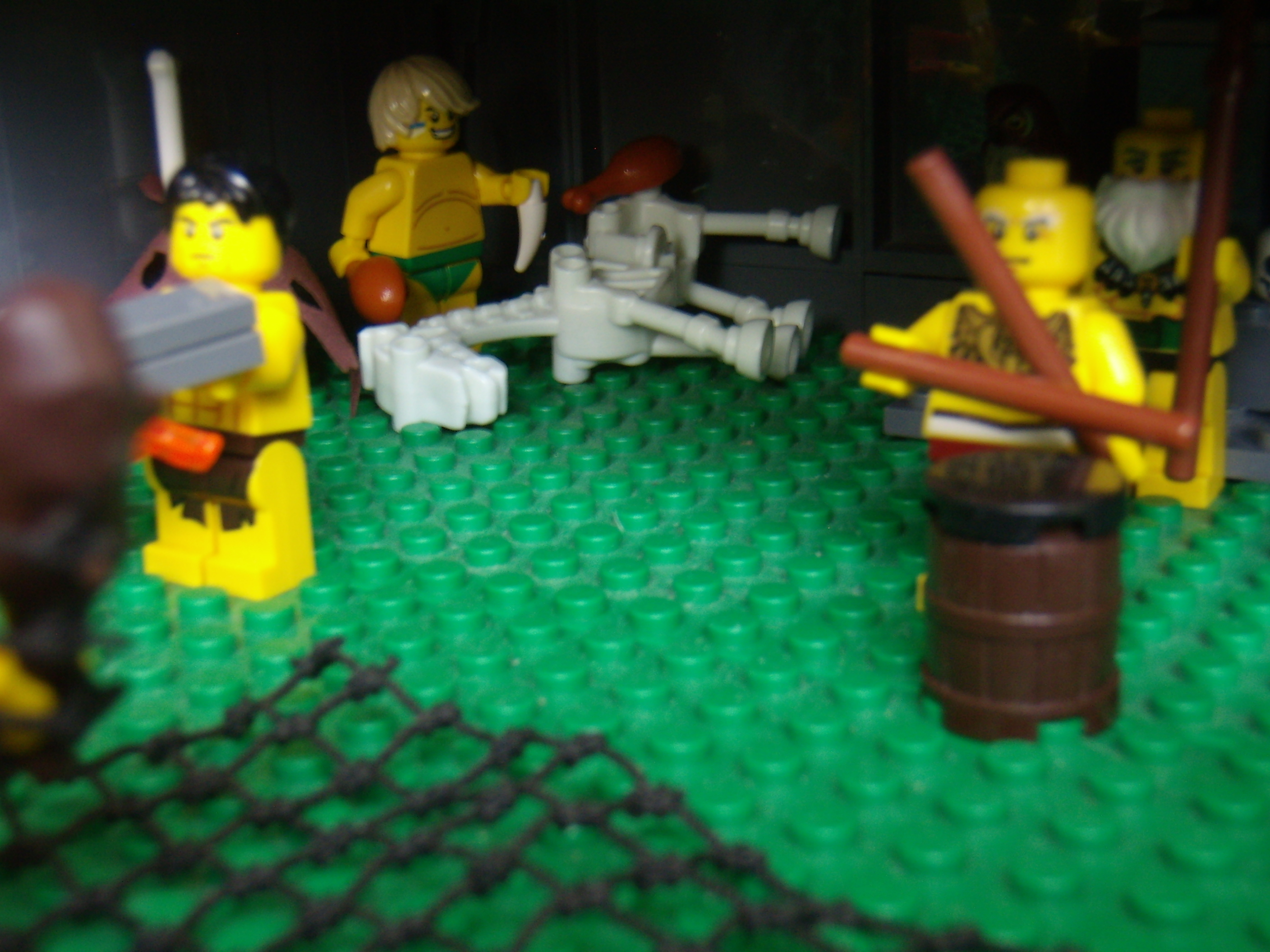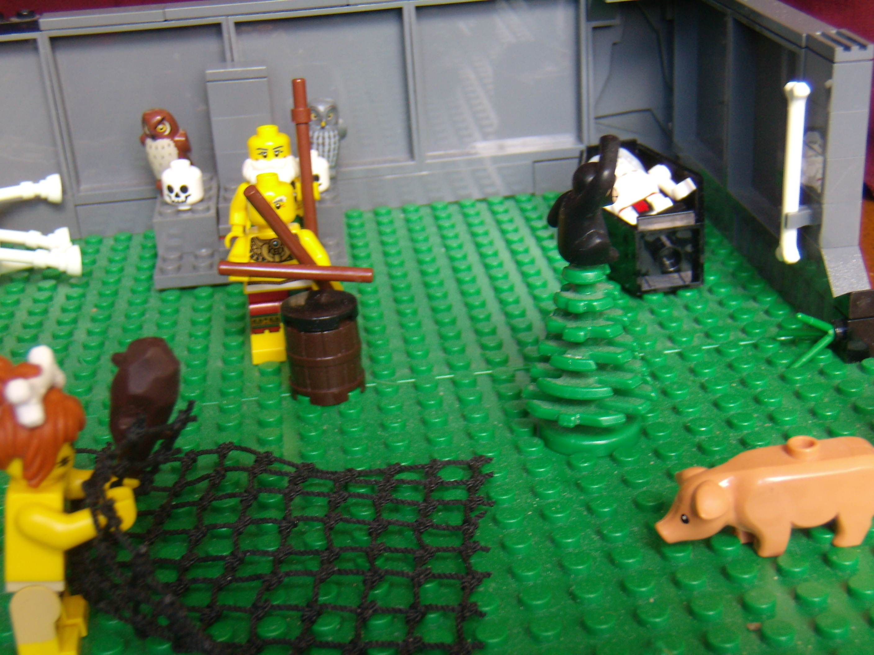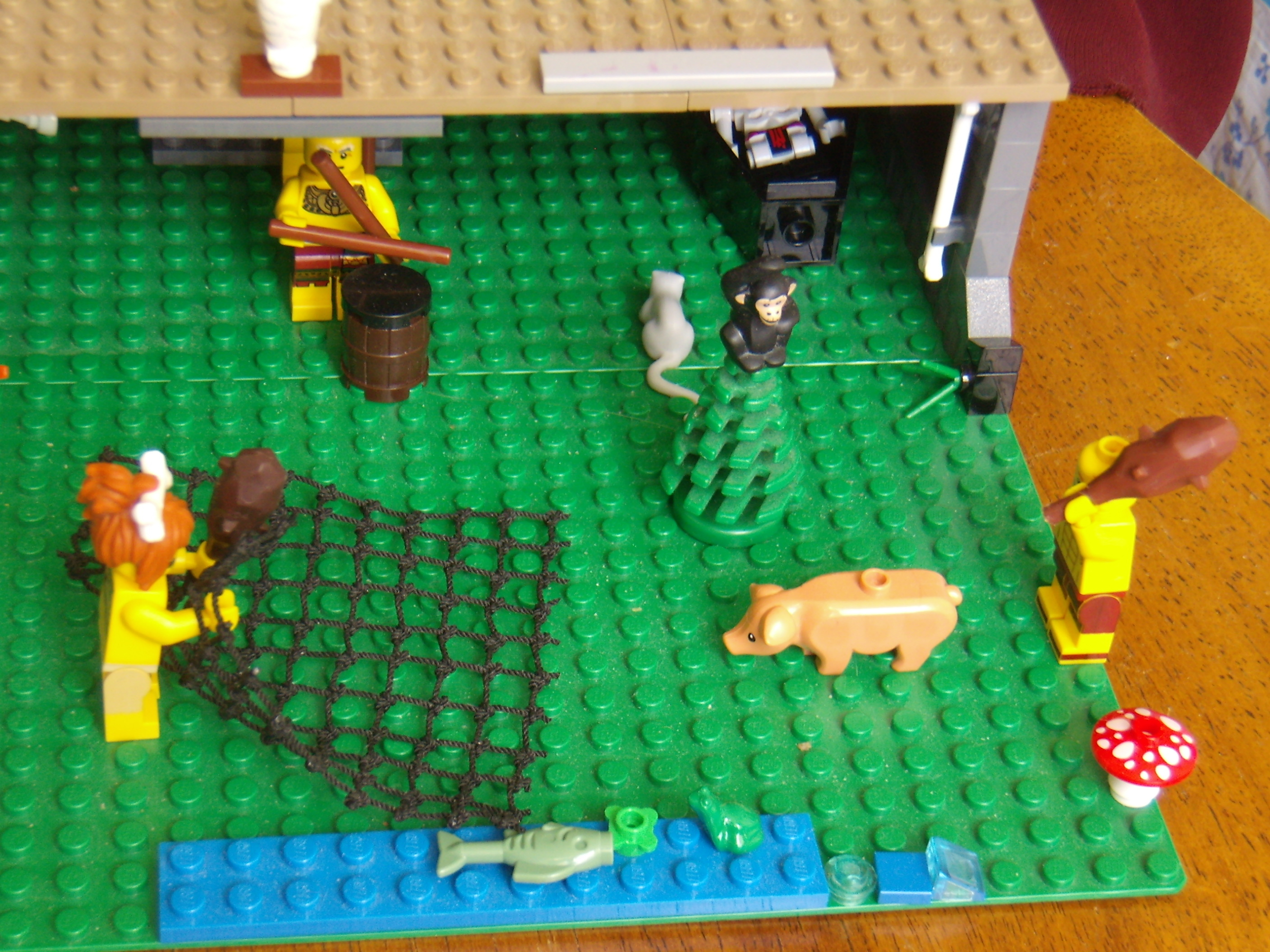 LEGO MOC - Because we can! - Caveman fire discovery: Река и улов на берегу. Пещерная женщина постаралась и поймала сетью к обеду рыбу, лягушку и водоросли, а теперь вот-вот поймает свинью.