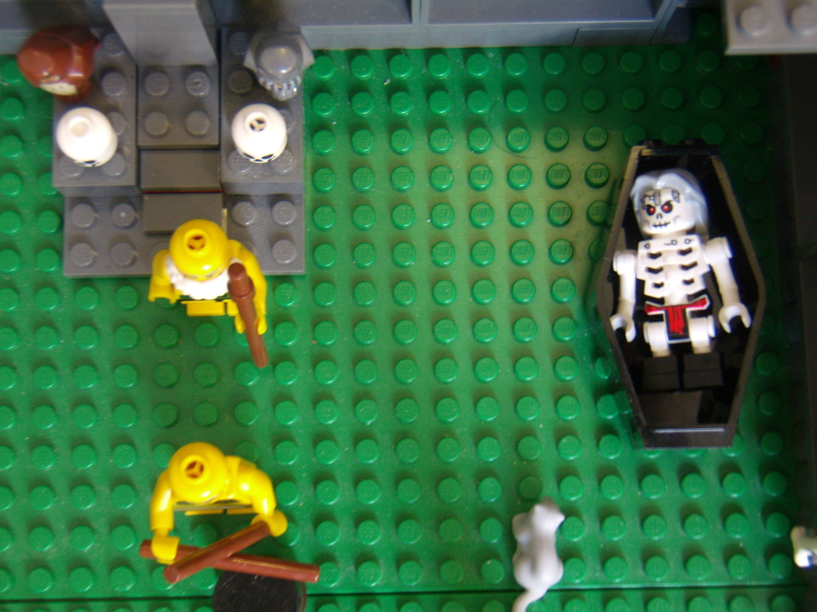 LEGO MOC - Because we can! - Caveman fire discovery: Старейшина клана пещерных людей с седой бородой и его предшественник в гробу.