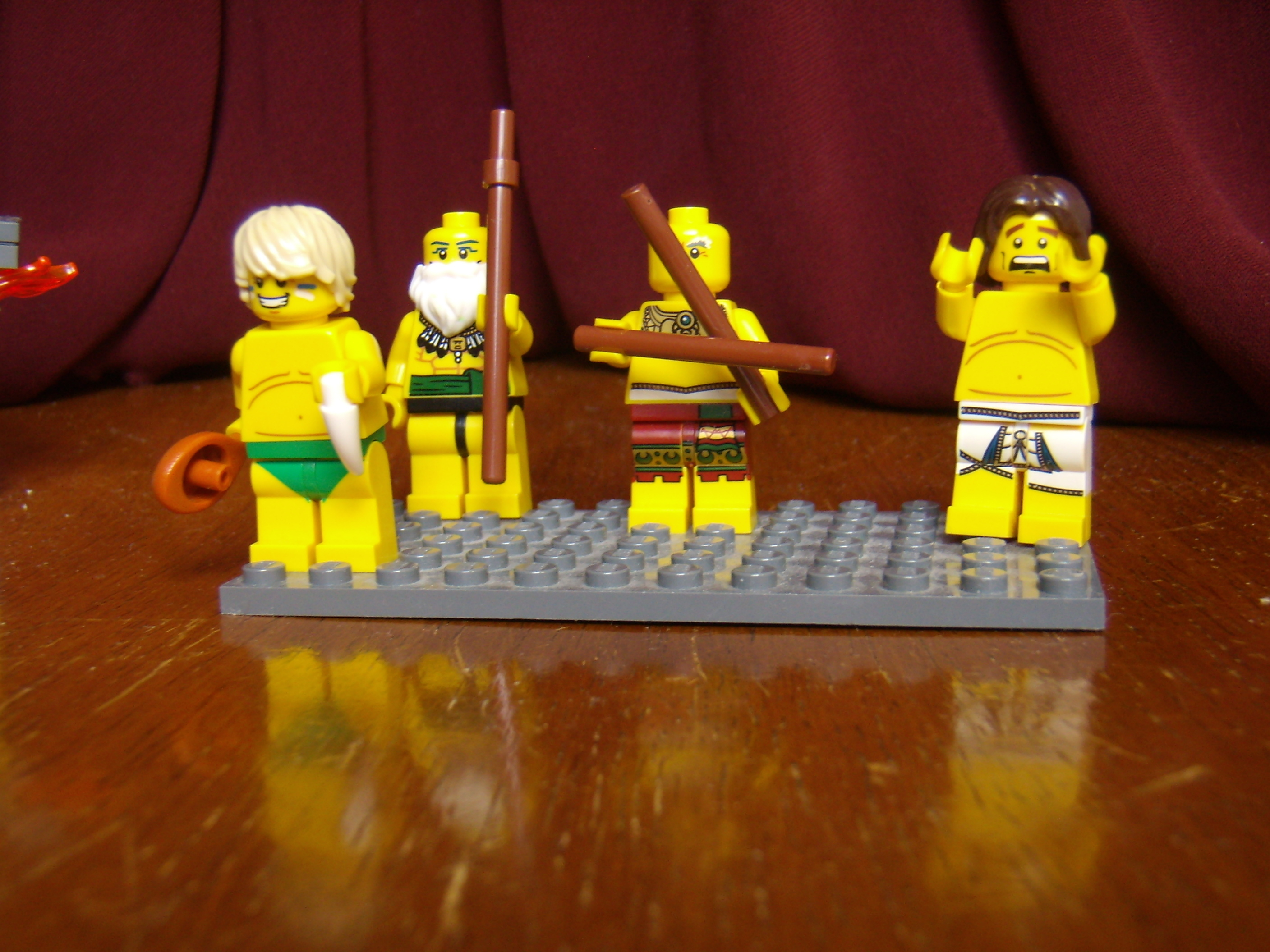 LEGO MOC - Because we can! - Caveman fire discovery: Минифигурки пещерных людей (слева направо): повар, старейшина, барабанщик, трусливый пещерный человек.