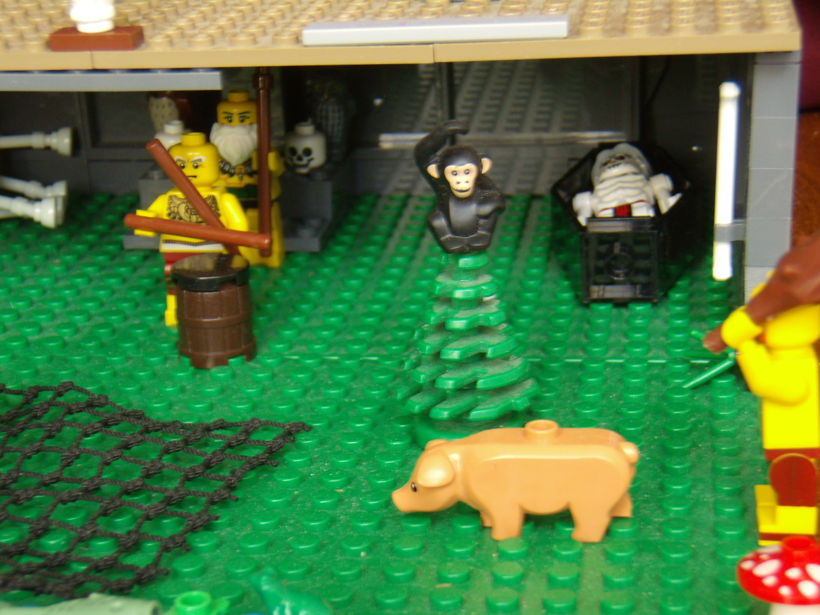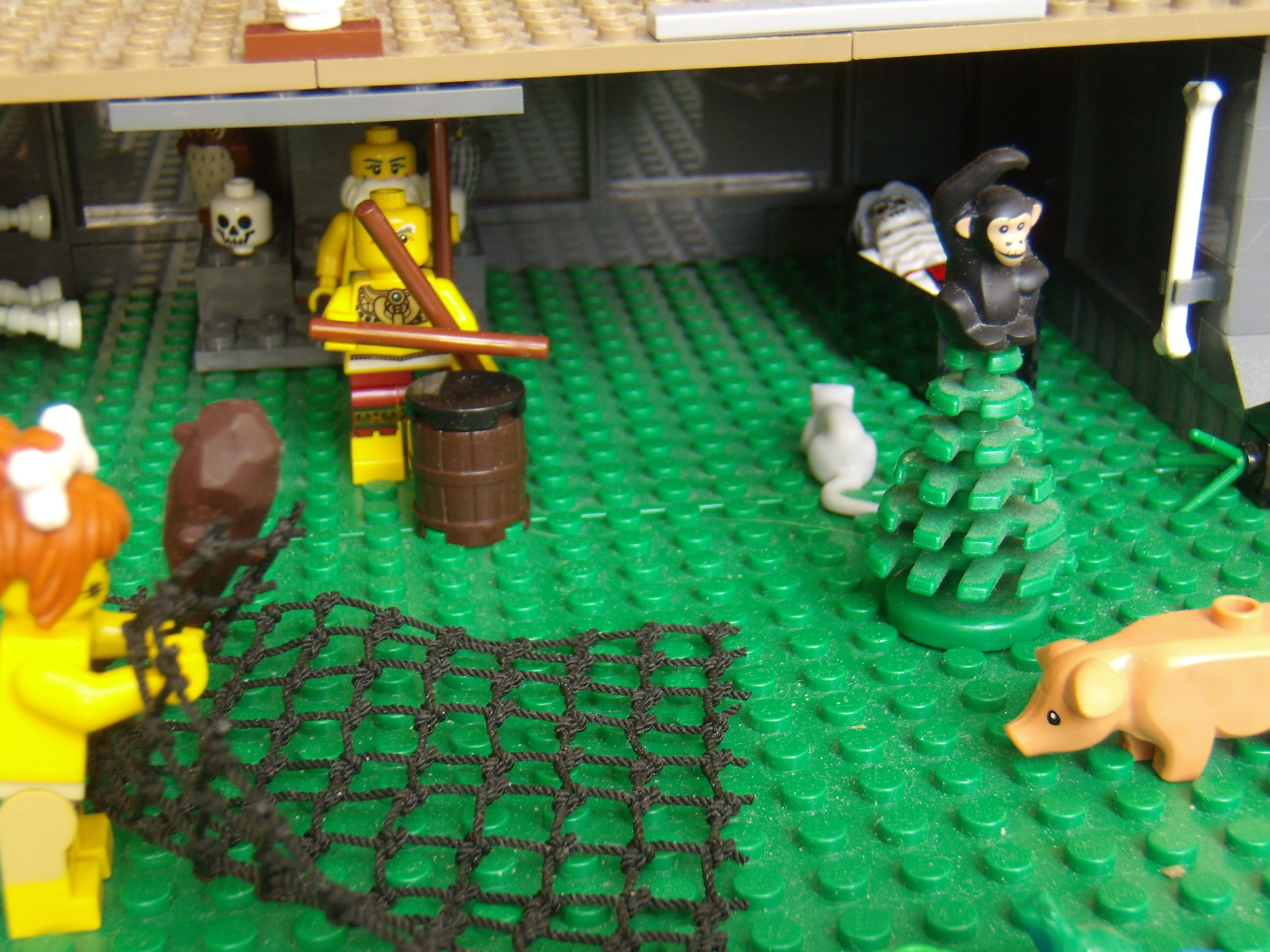 LEGO MOC - Because we can! - Caveman fire discovery: Обезьяна спряталась на дерево, а свинья не может лазить по деревьям, поэтому пытается убежать.