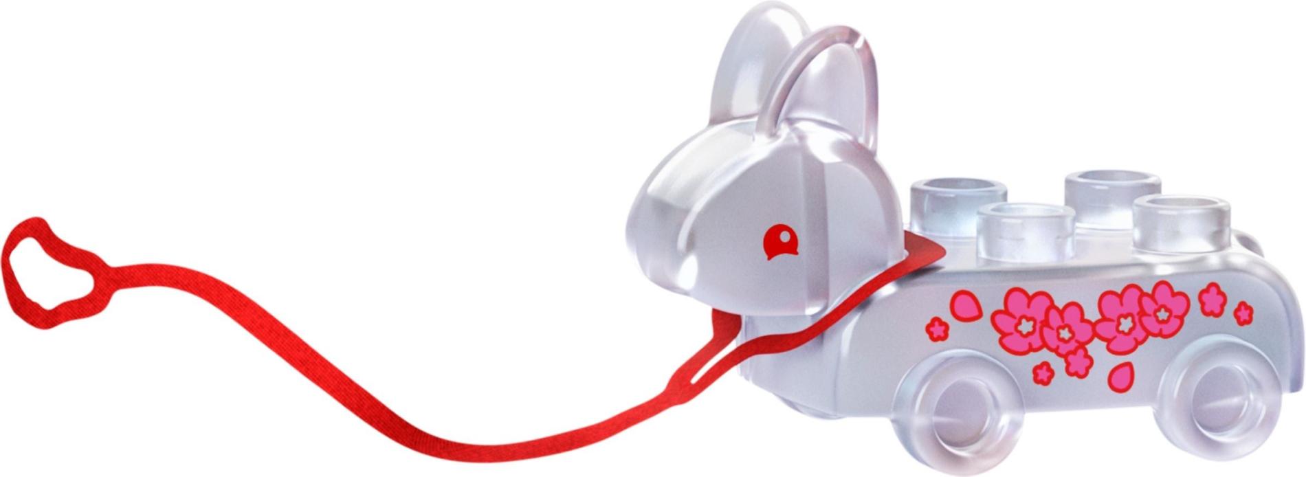 | 1 X Duplo Pull Toy Bunny / Rabbit on Wheels with Red Eyes and Dark Pink Flowers Pattern | |   |  |