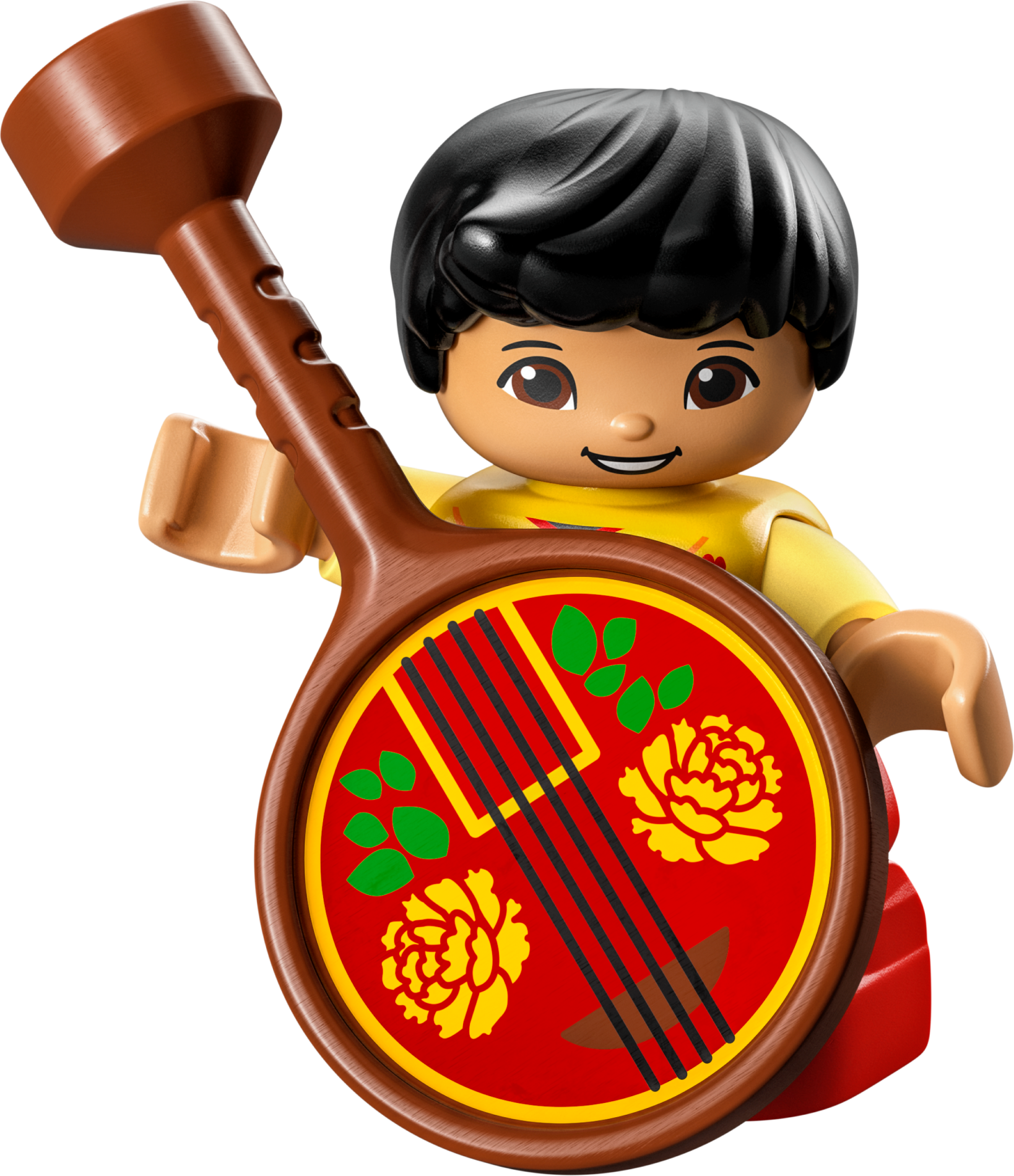| 1 X Duplo Utensil Round Sign with Handle with Red Sound Board, Black Strings, Yellow Flowers, and Bright Green Leaves Pattern (Musical Instrument, Ruan / Moon Guitar) | Reddish Brown |   |  |