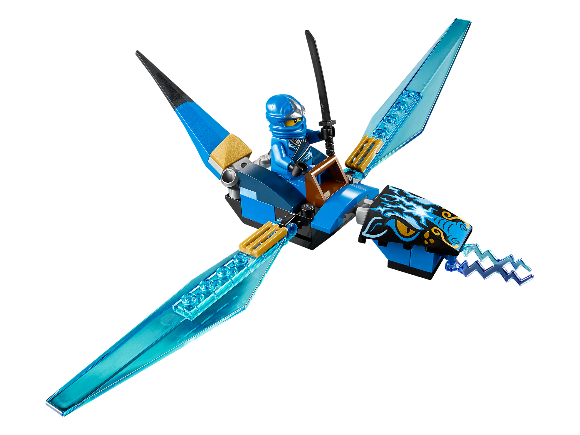 | 1 X Wedge 4 x 4 No Top Studs with Dragon Head and 2 Golden Eyes and White and Blue Lightning Pattern (10725) | Black |   |  |