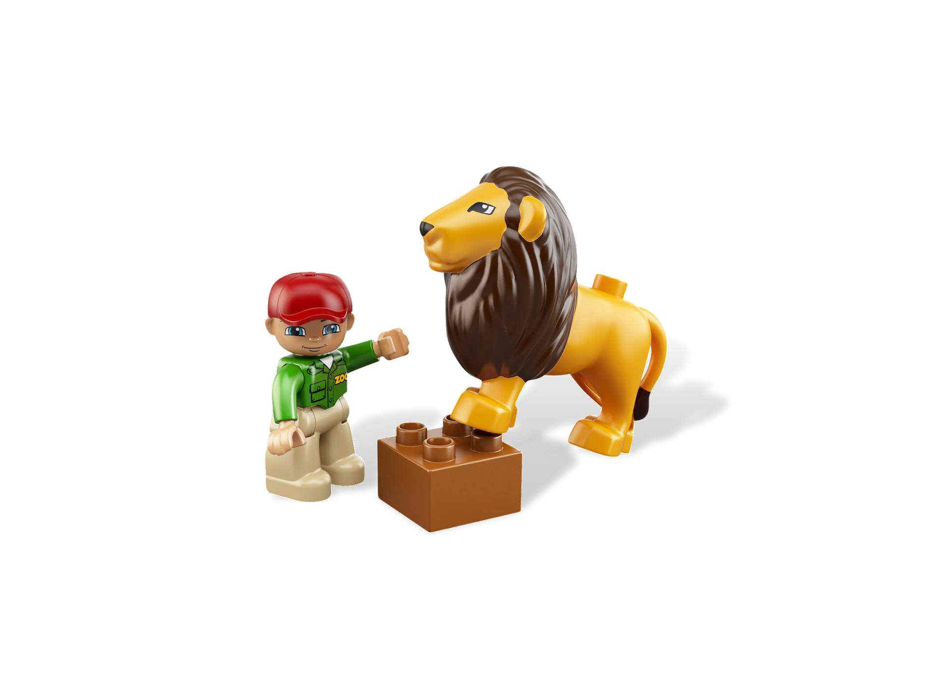 Duplo Figure Lego Ville, Male, Tan Legs, Green Top with 'ZOO' on Front and Back, Red Cap, Blue Eyes (Zoo Worker)