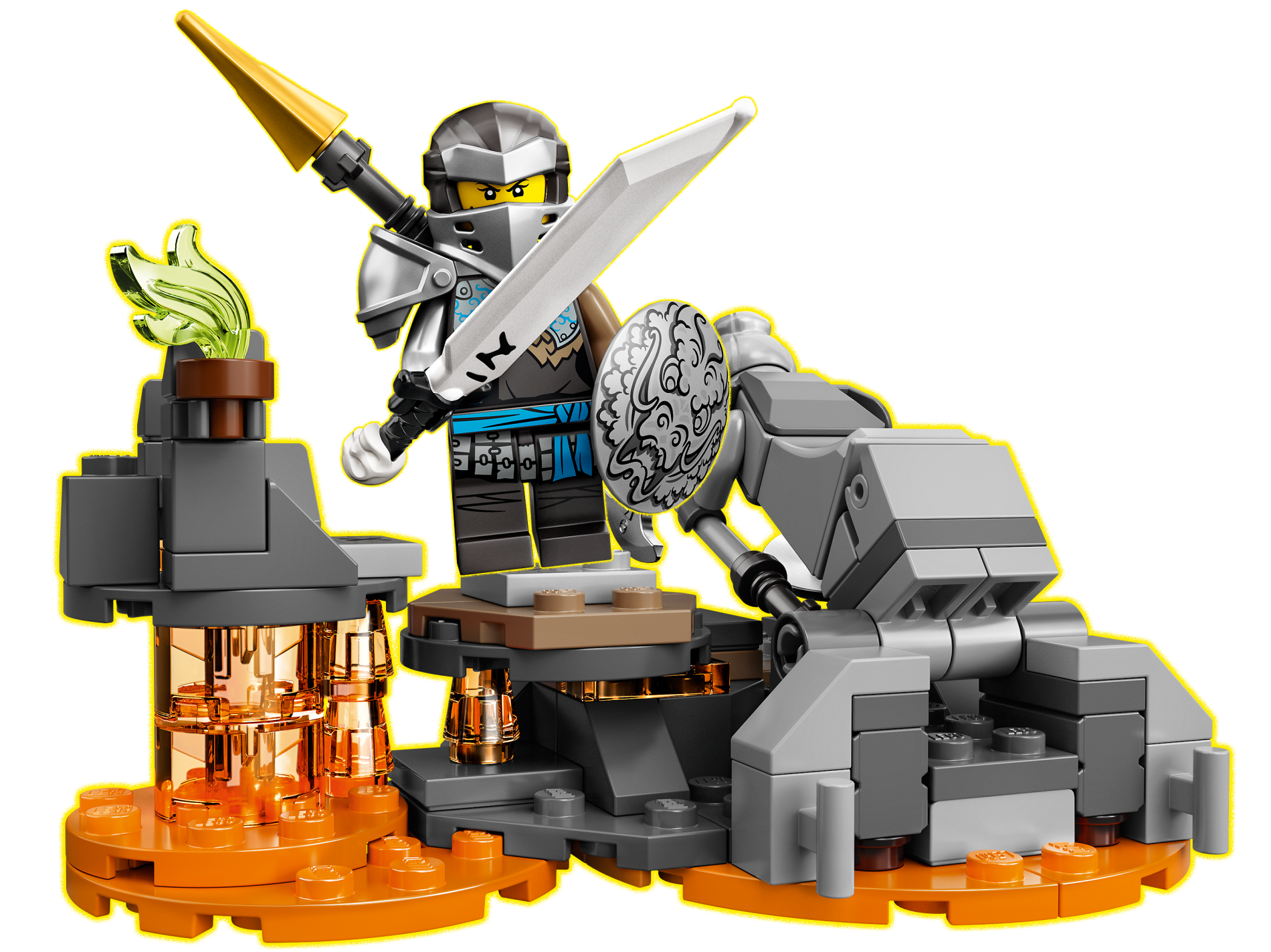 | 1 X Minifigure, Shield Round with Rounded Front with Black and Gold Ninjago Lion Head Pattern | Pearl Gold |   |  |