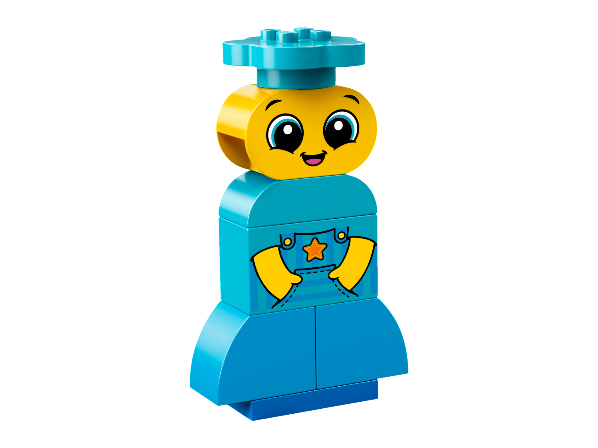 | 1 X Duplo, Brick 2 x 4 x 2 with Striped Dungarees, Hands in Pockets and Orange Star Pattern | Medium Azure |   |  |