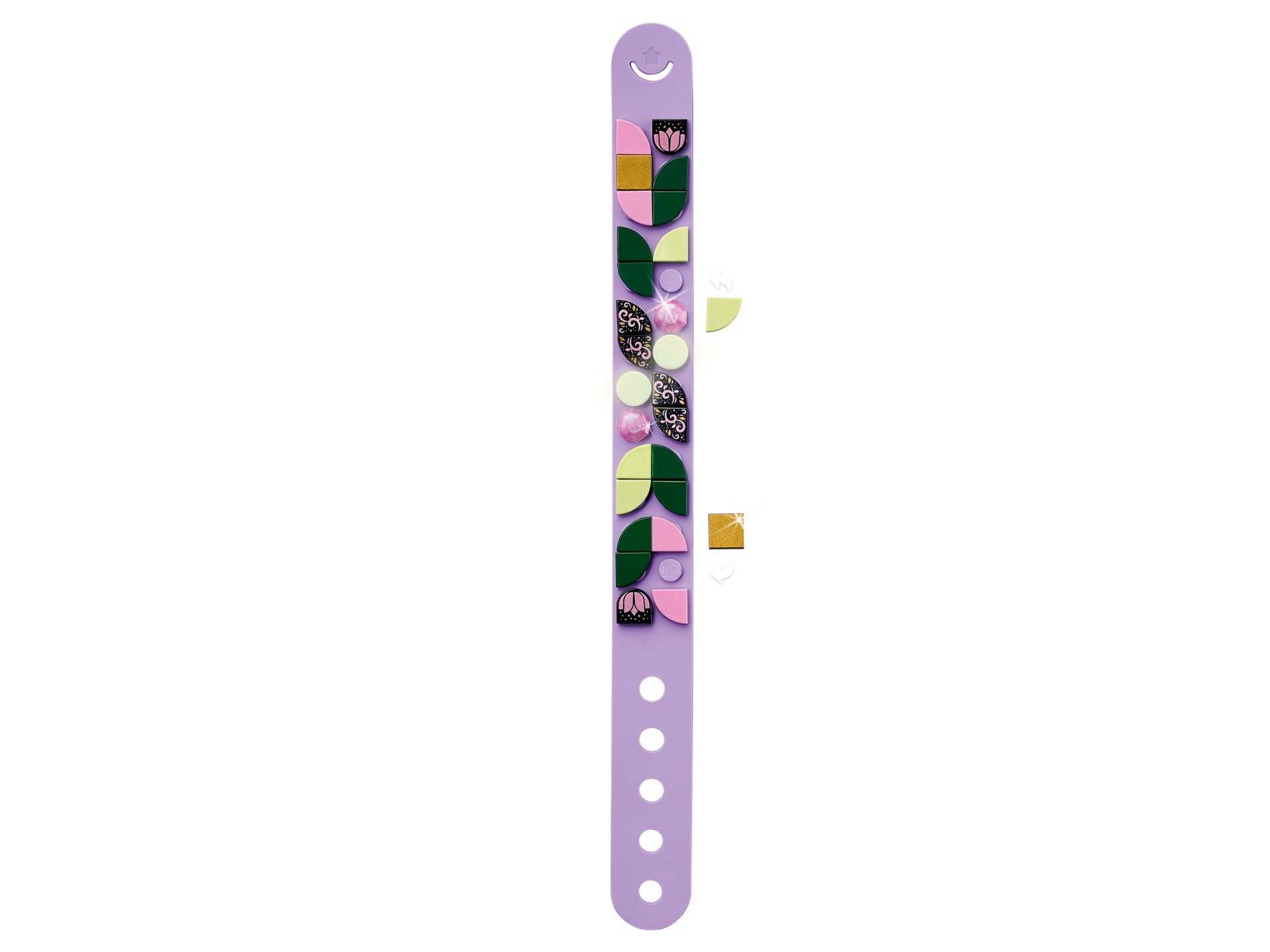 | 1 X Tile, Modified 1 x 1 Half Circle Extended (Stadium) with Shiny Pink Rose and Gold and Shiny Blue Dots Pattern | Black |   |  |